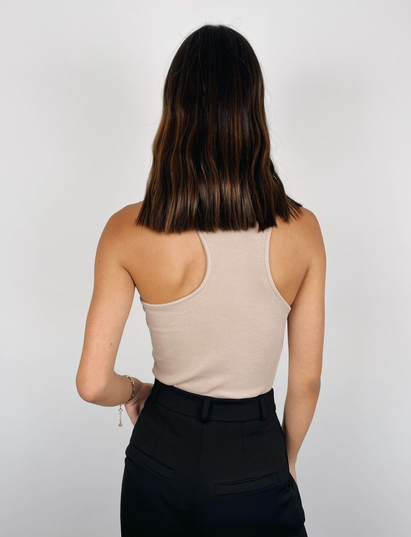 בגד גוף מבד ריב רך, מחמיא לגזרה עם צווארון סגירה א-סימטרי.