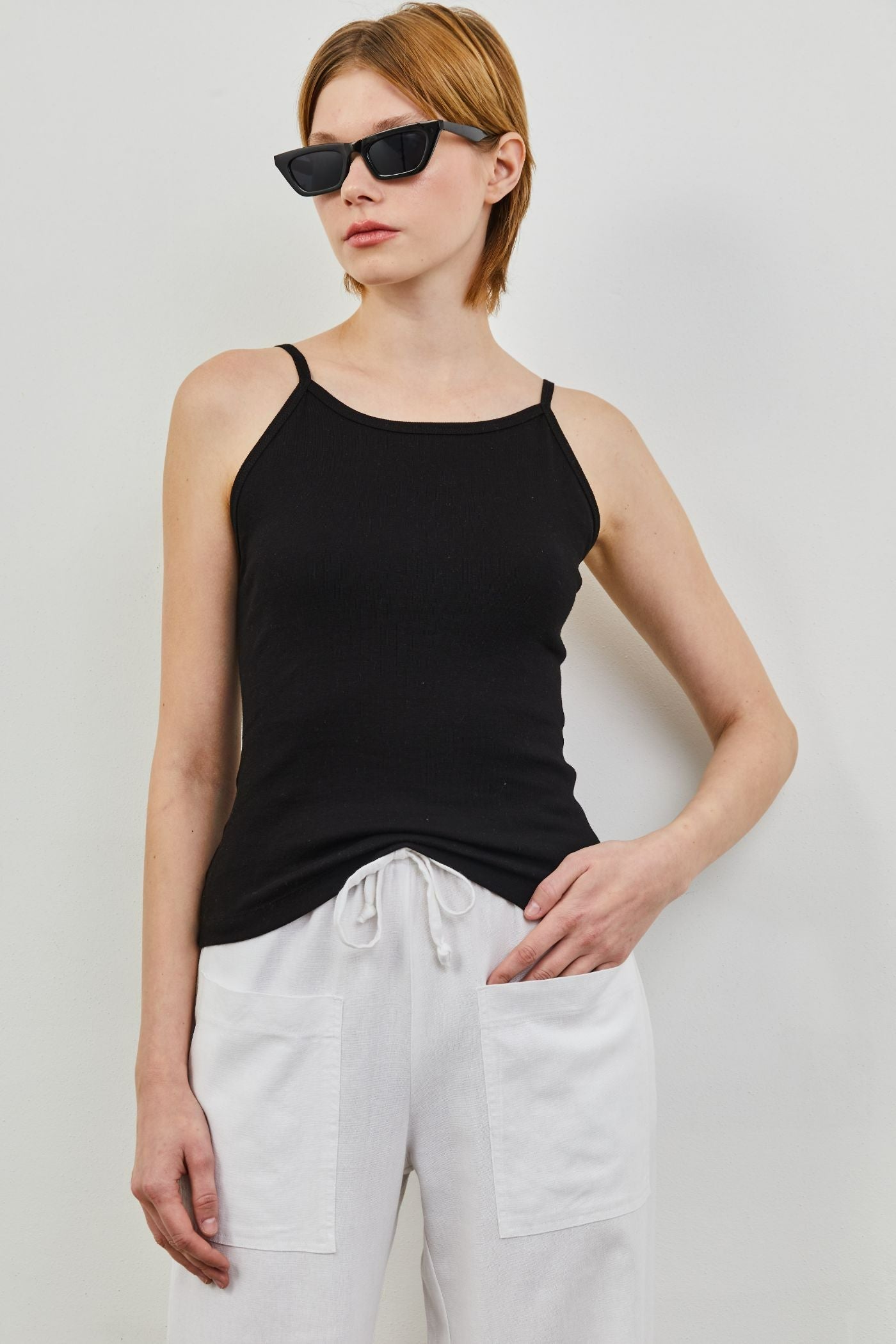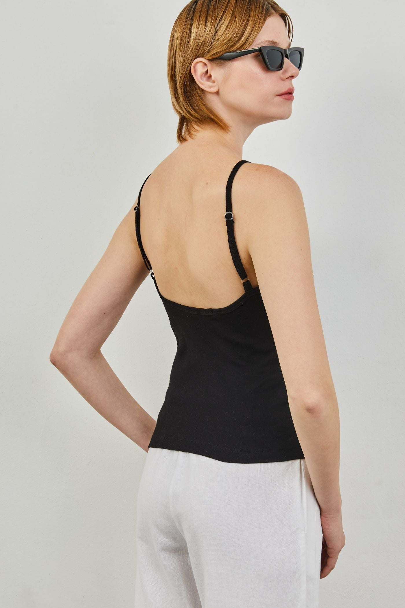 גופיית ספגטי בייסיק עם גב חשוף וכתפיות מתכווננות.