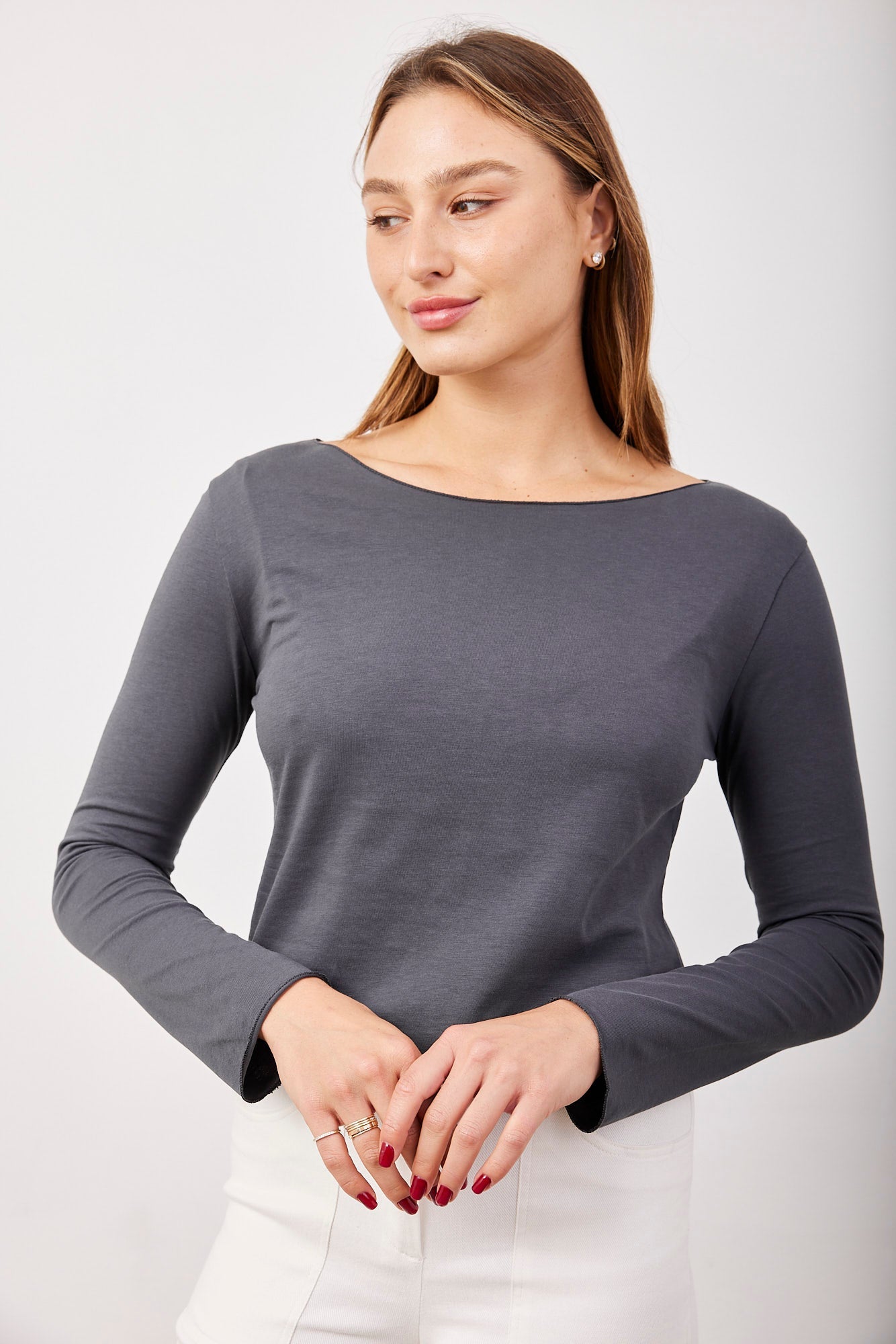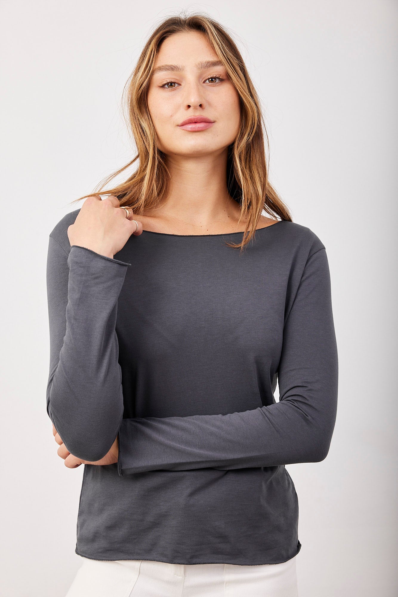 חולצה ארוכה עם מחשוף סירה וסיומת פרומה
