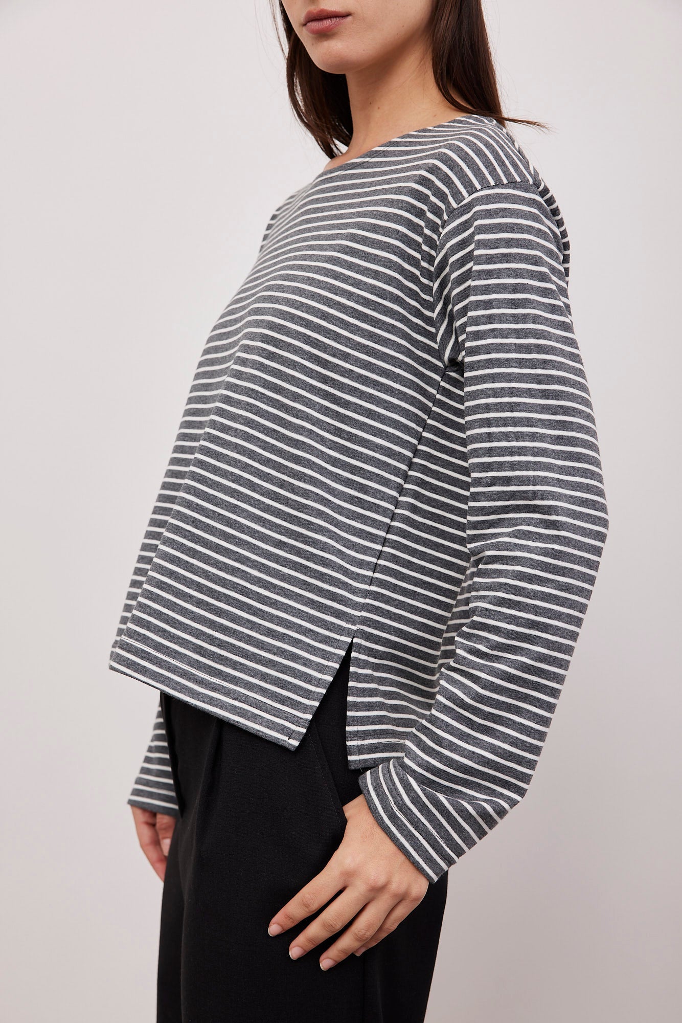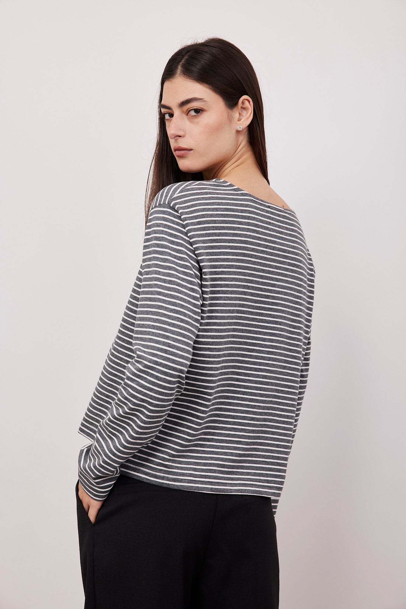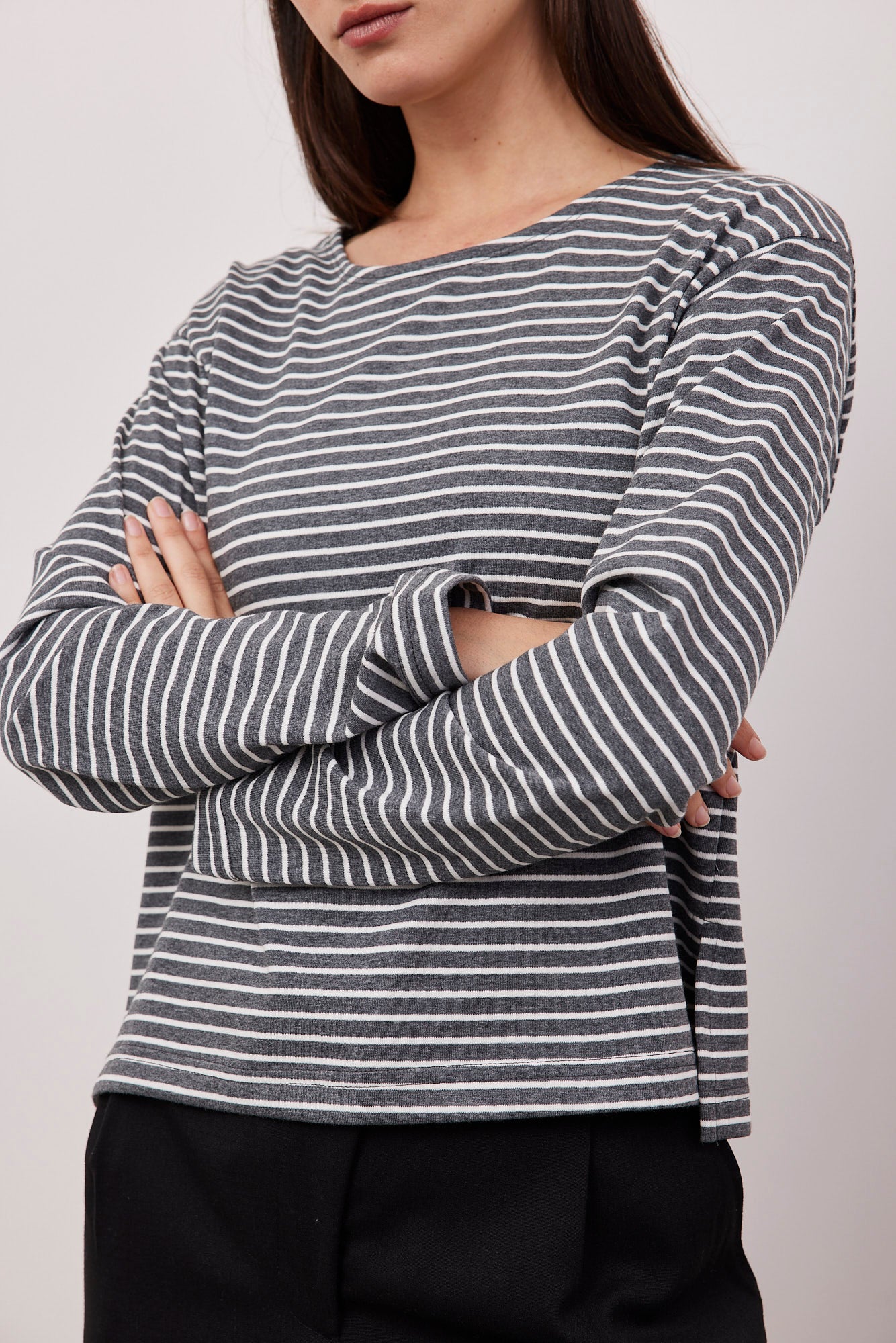 חולצת כותנה ארוכה דקה בהדפס פסים, עם מפתח עגול.