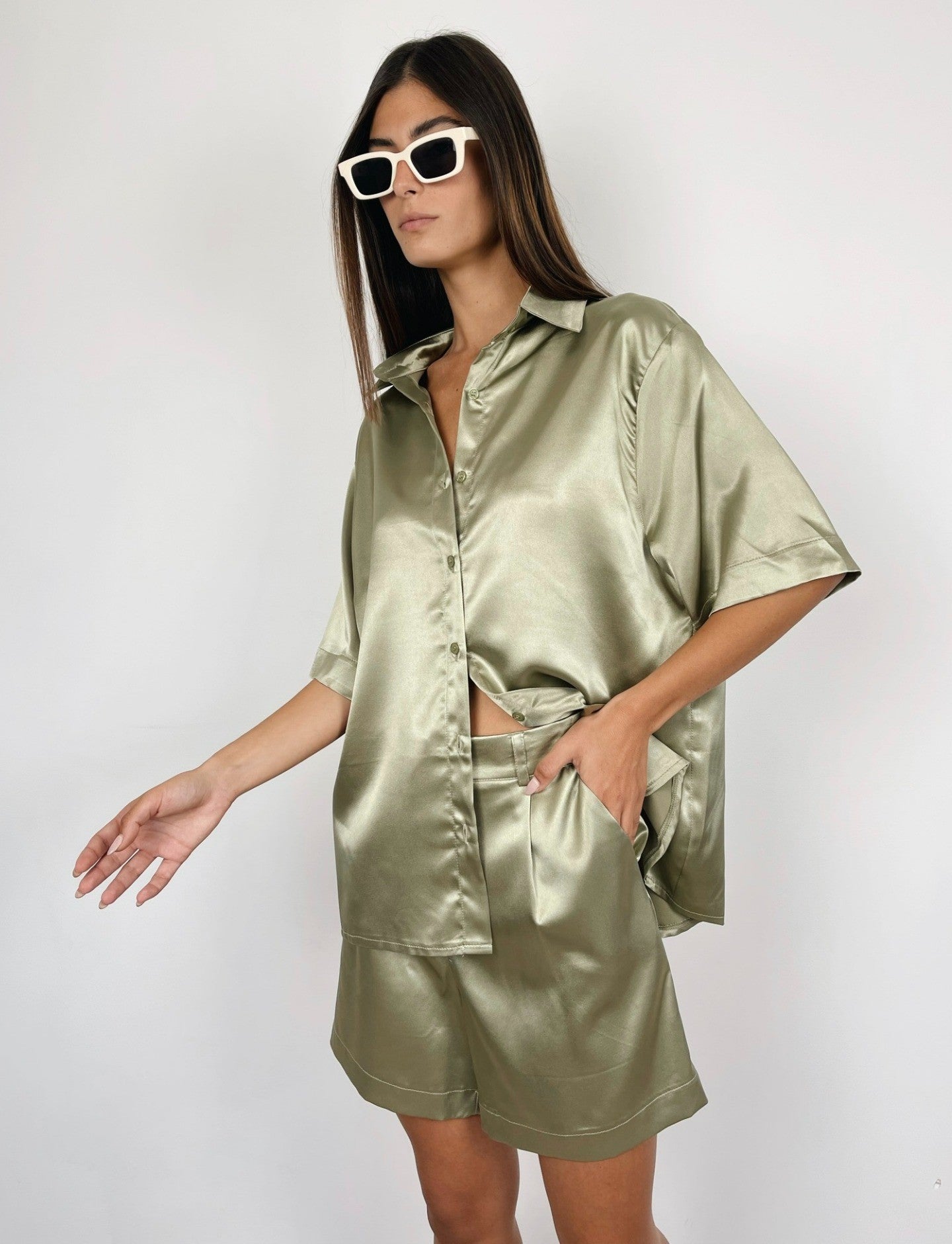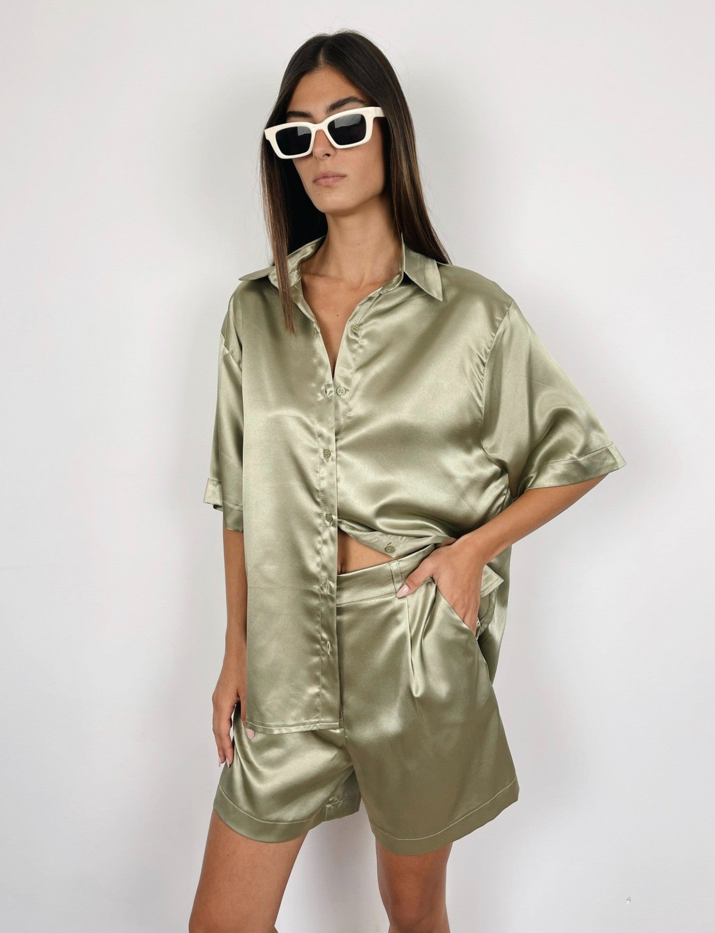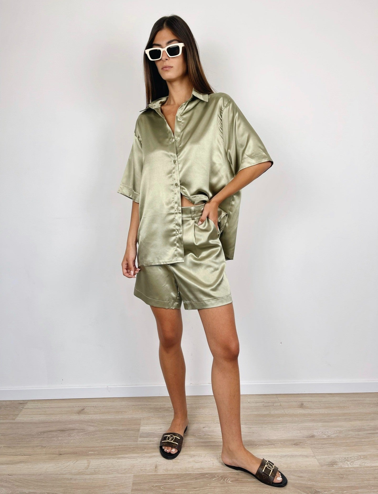 חליפת אוברסייז מבד סטן. שורטס עם סגירת רוכסן וקרס נסתרים וחולצה מכופתרת.