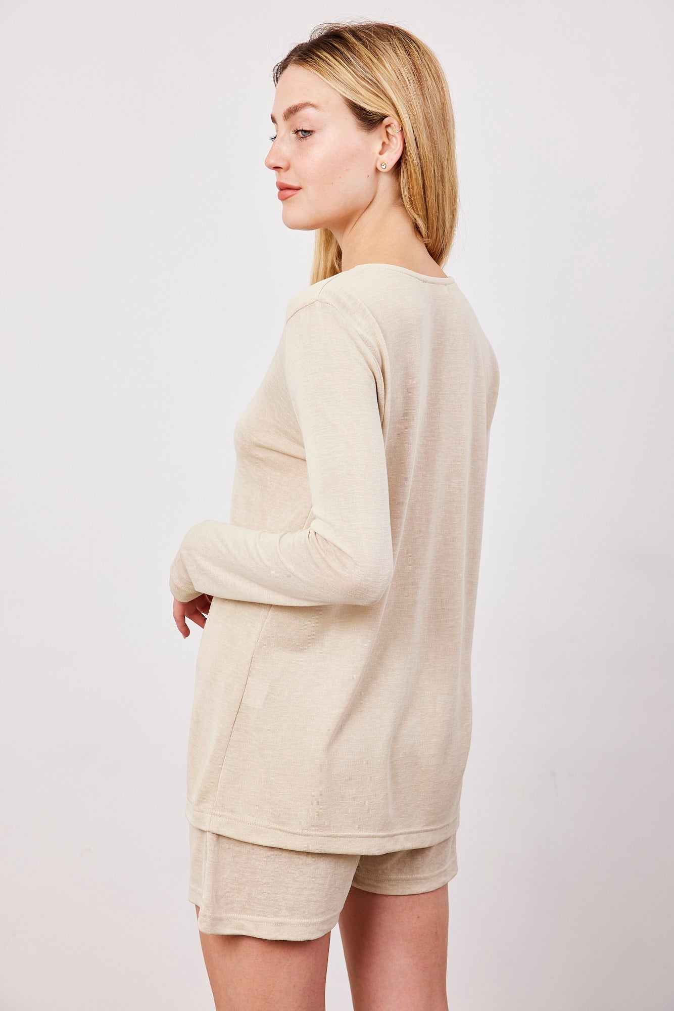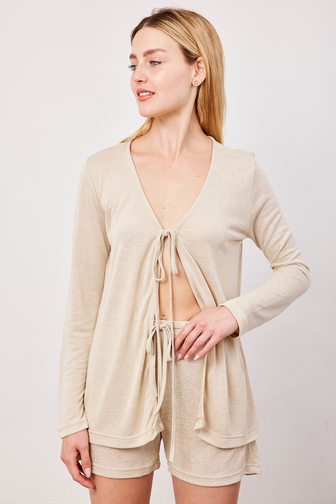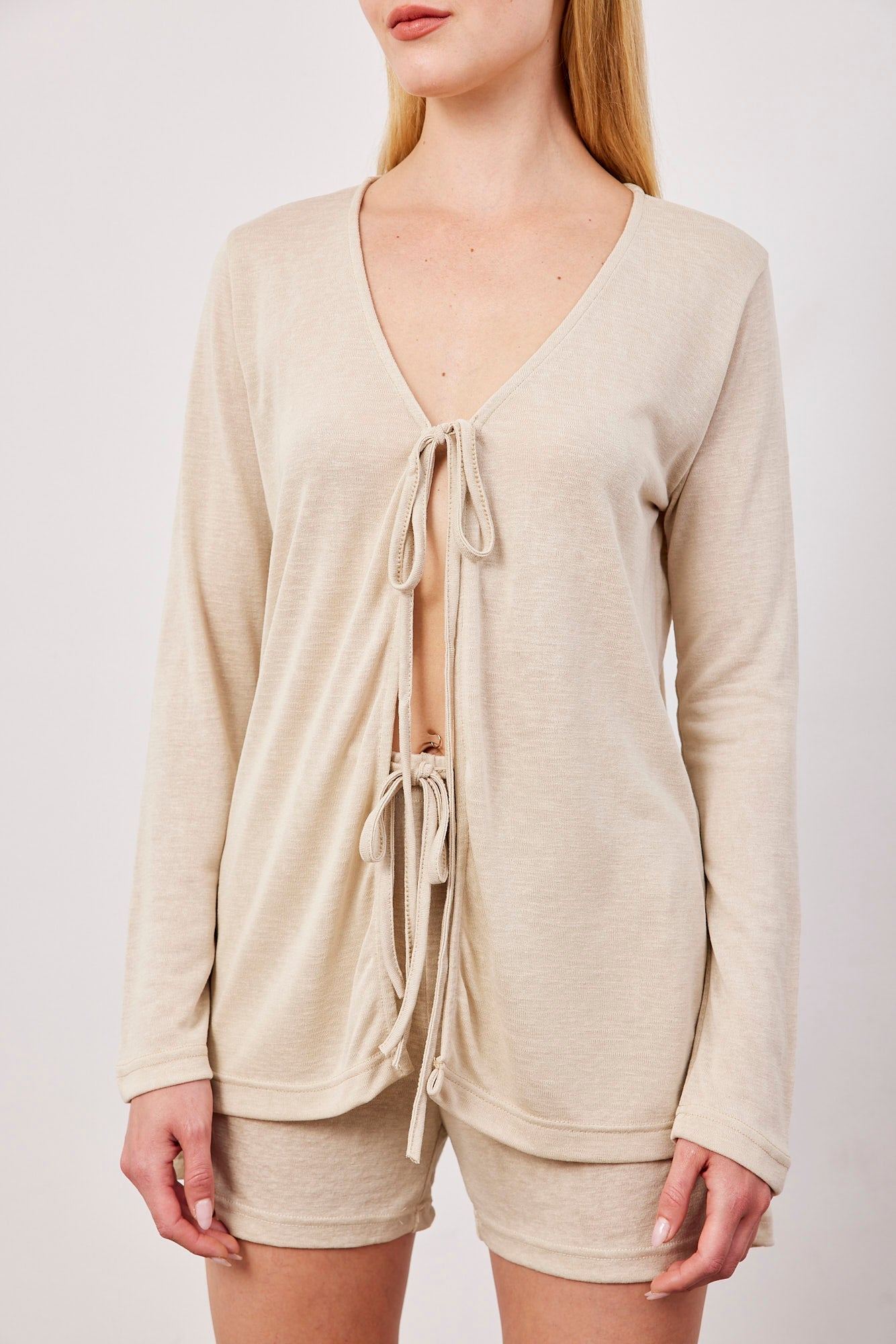 חליפת שני חלקים. חולצה עם סגירת קשירה ומכנסיים קצרים עם גומי במותן
