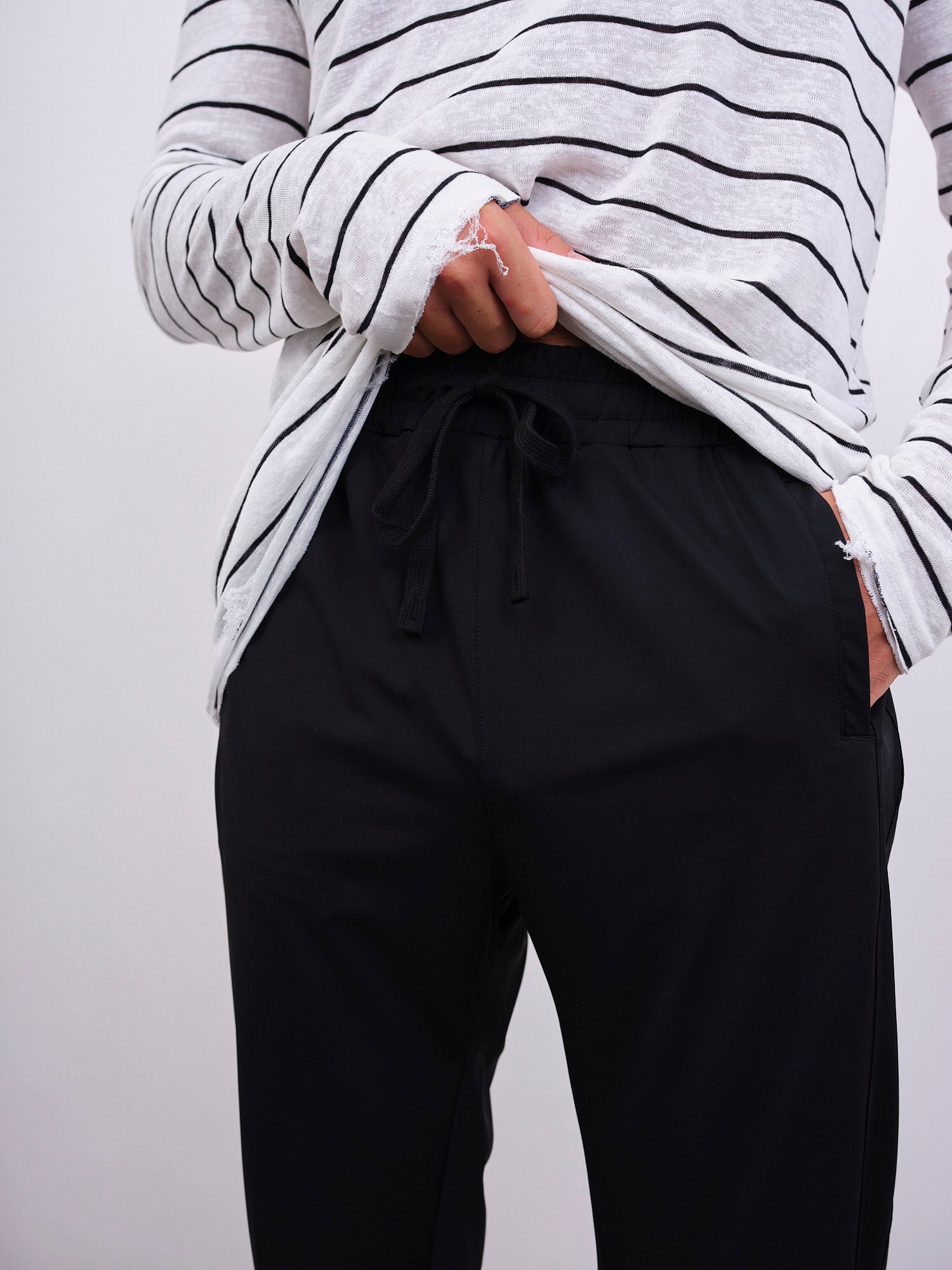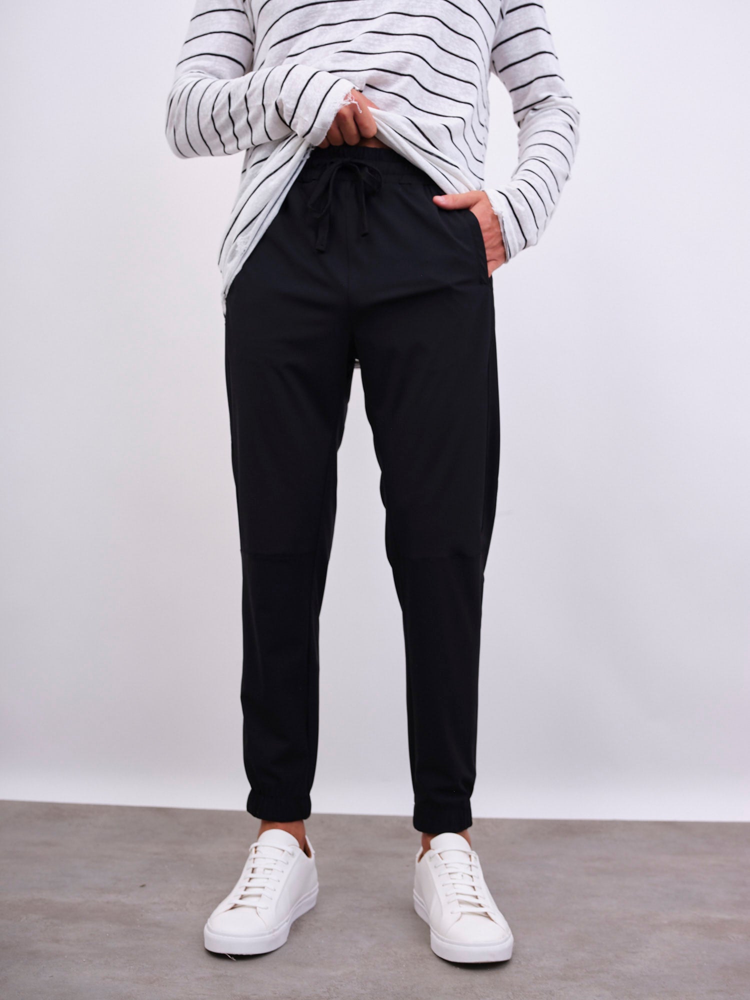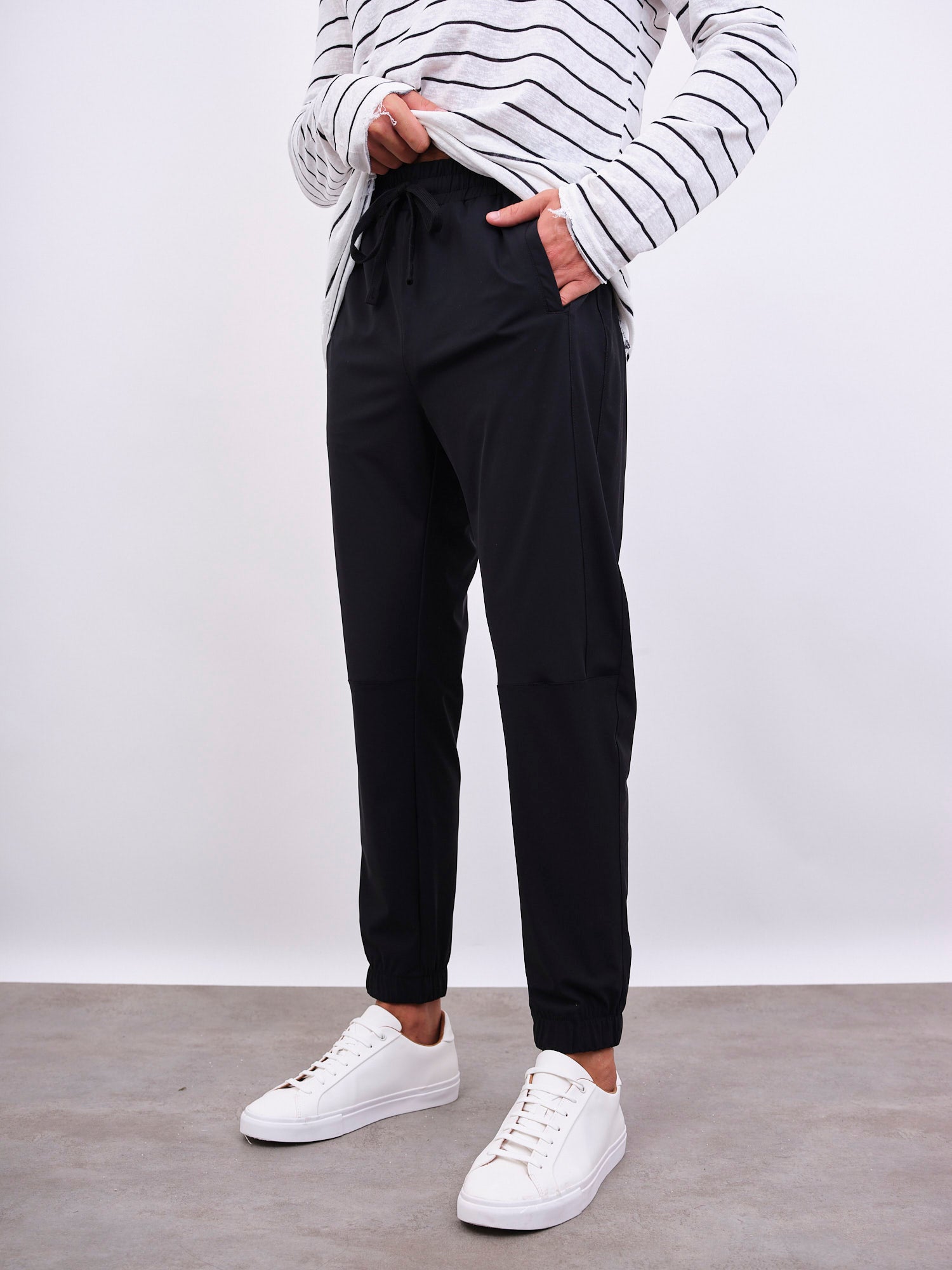 מכנסיים ארוכים עם גומי וקשירה במותן, גומי בסיומת וכיסים צידיים.