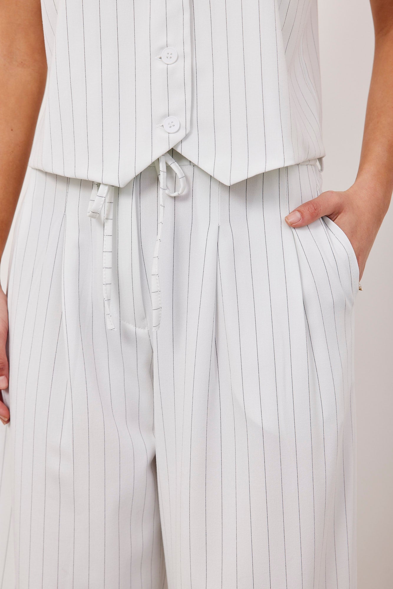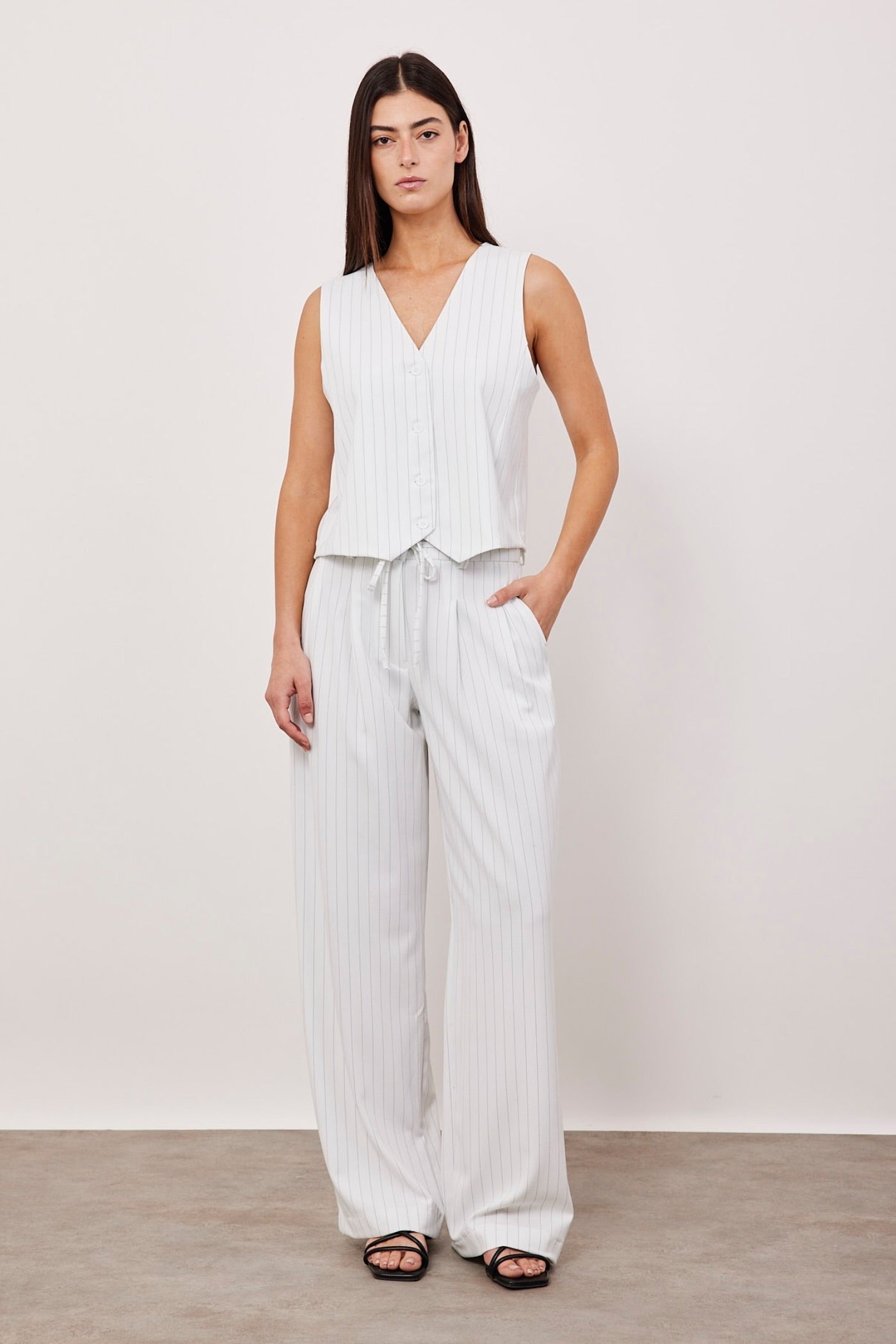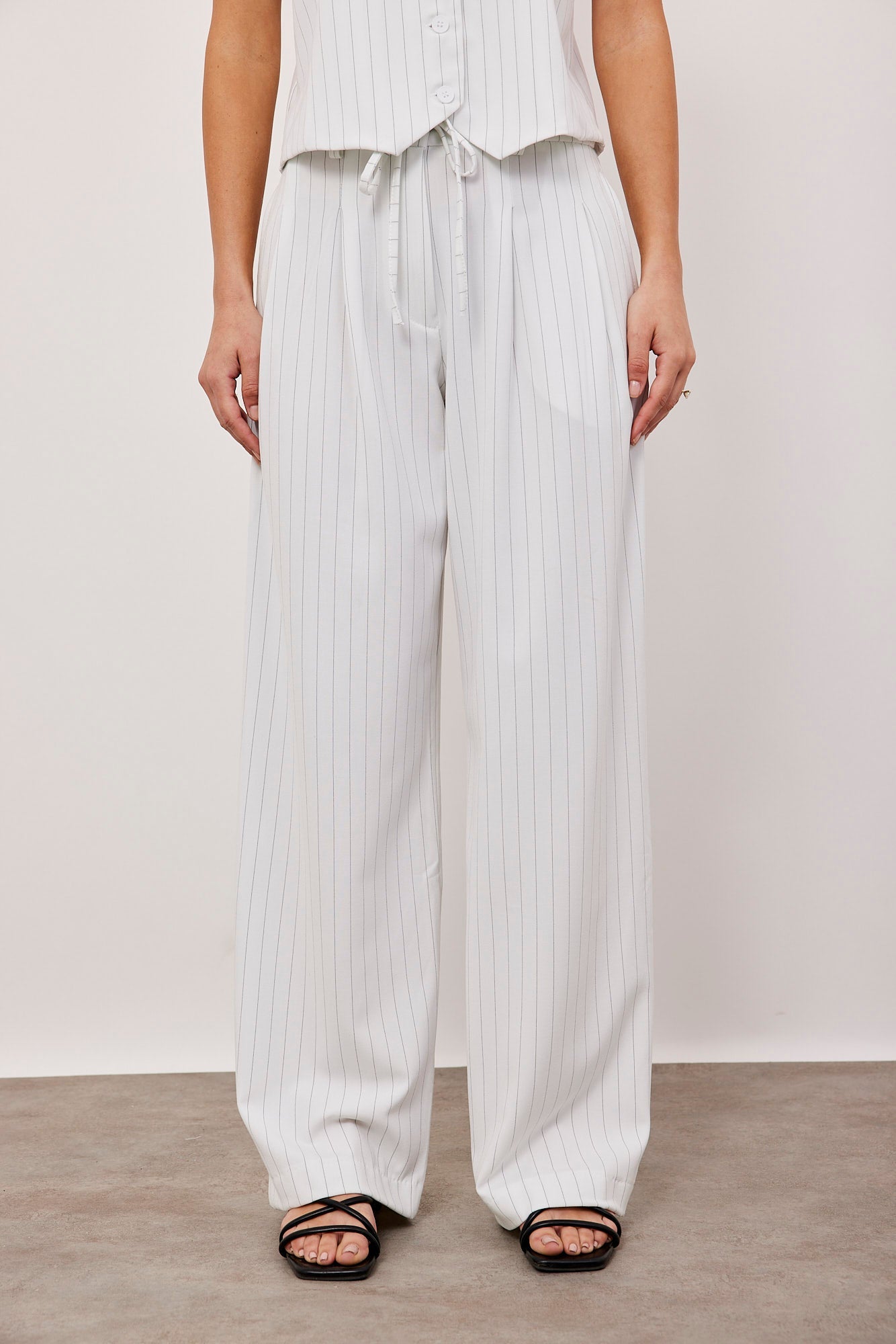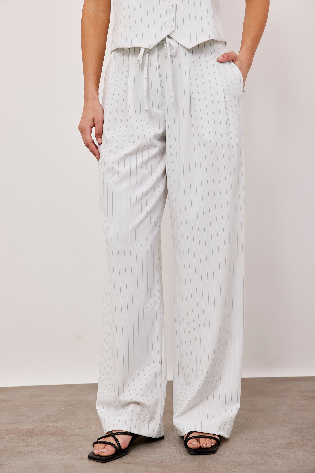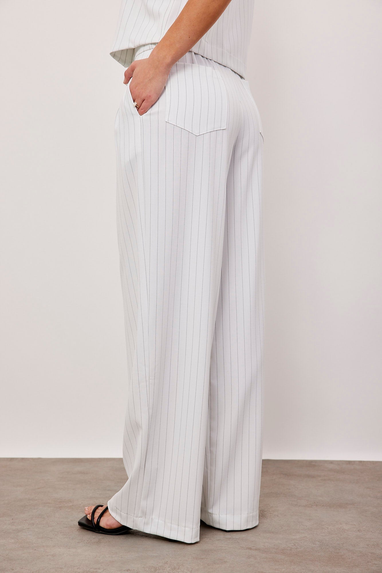 מכנסיים ארוכים בהדפס פסים עדין, עם שרוך וגומי במותן.